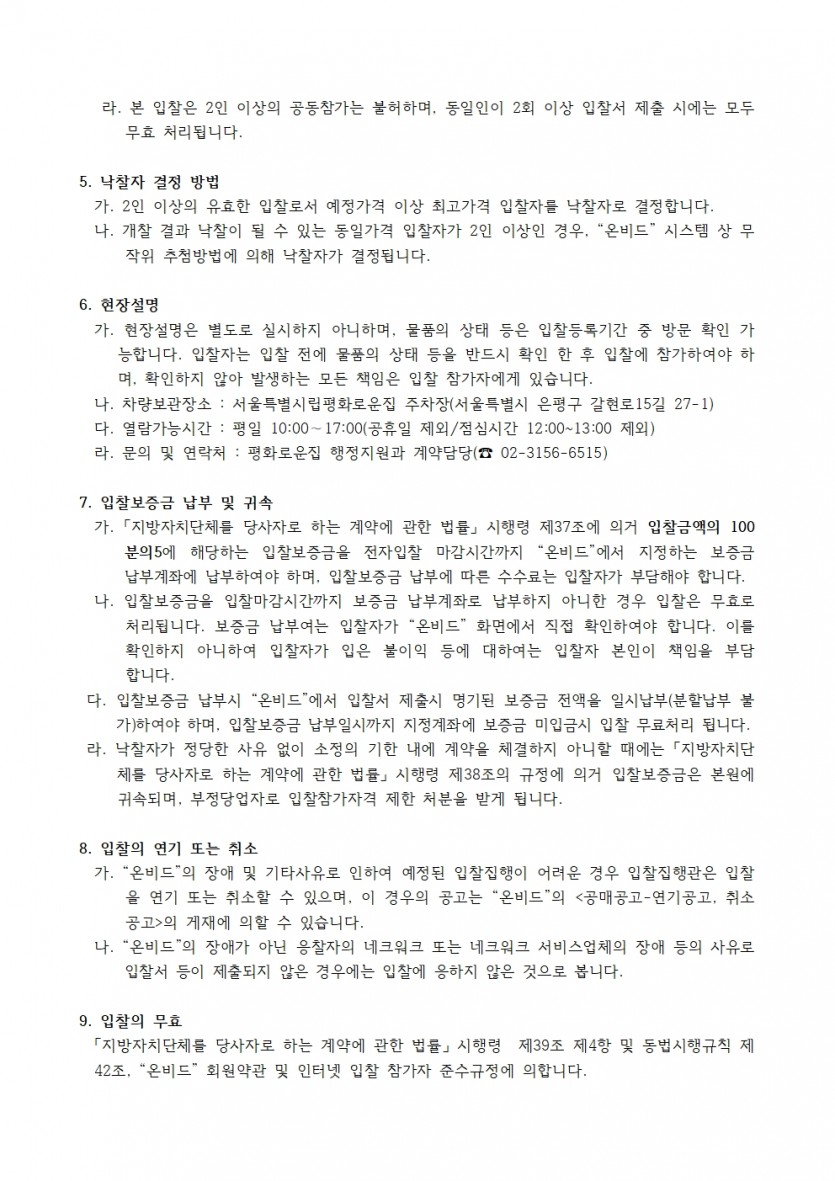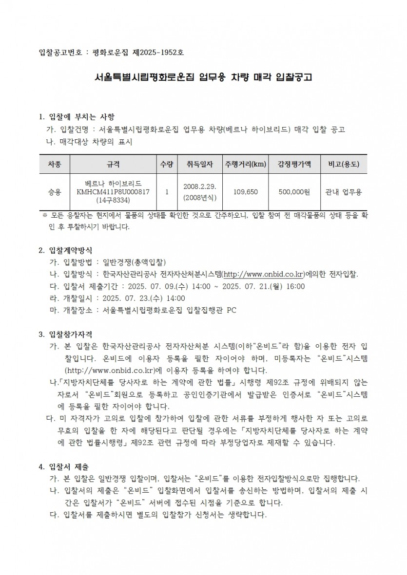 업무용 차량 매각 한국자산관리공사 전자자산처분시스템(온비드) 입찰공고 페이지 정보 작성자 한동주 작성일 25-07-09 11:45 조회 8,518회 댓글 0건 첨부파일 파일 입찰공고서_온비드_차량매각_공고문.hwp (70.5K) 91회 다운로드 DATE : 2025-07-09 11:45:50 본문 이전글 다음글 목록 답변