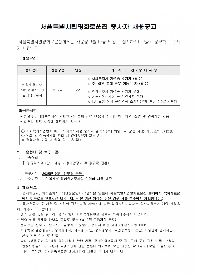 평화로운집 2025년 3차 종사자(생활지도원) 채용 공고 페이지 정보 작성자 한동주 작성일 25-05-02 14:08 조회 11,063회 댓글 0건 첨부파일 파일 2025년-생활지도원 3차.hwp (114.5K) 97회 다운로드 DATE : 2025-05-02 14:08:29 파일 시립평화로운집 입사지원서이력서,자기소개서및개인정보동의서.hwp (54.0K) 149회 다운로드 DATE : 2025-05-02 14:08:29 본문 평화로운집 2025년 3차 종사자(생활지도원) 채용을 다음과 같이 공고합니다. 이전글 다음글 목록 답변