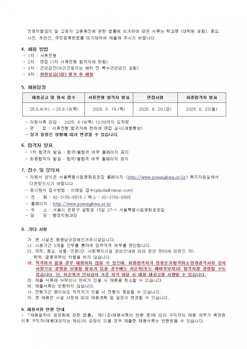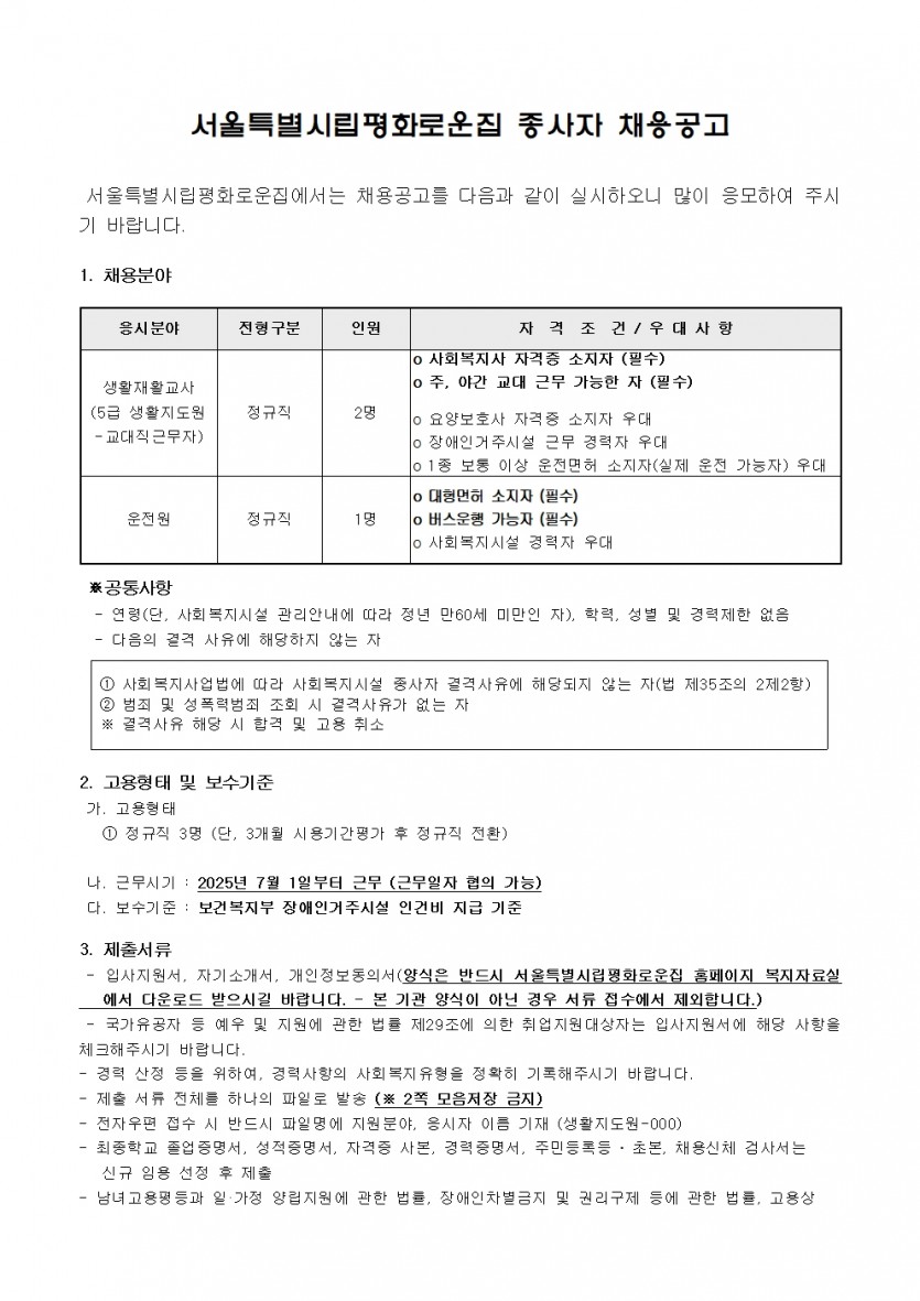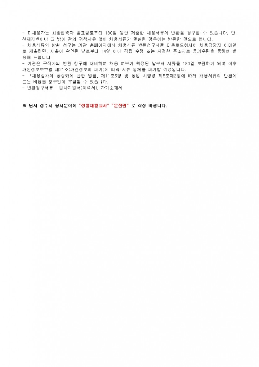 제4차 직원채용 공고(생활지도원, 운전원) 페이지 정보 작성자 한동주 작성일 25-06-04 13:54 조회 10,120회 댓글 0건 첨부파일 파일 시립평화로운집 입사지원서이력서,자기소개서및개인정보동의서.hwp (54.0K) 159회 다운로드 DATE : 2025-06-04 13:54:21 파일 2025년 4차 운전원, 생활지도원.hwp (117.5K) 131회 다운로드 DATE : 2025-06-04 16:44:36 본문 이전글 다음글 목록 답변