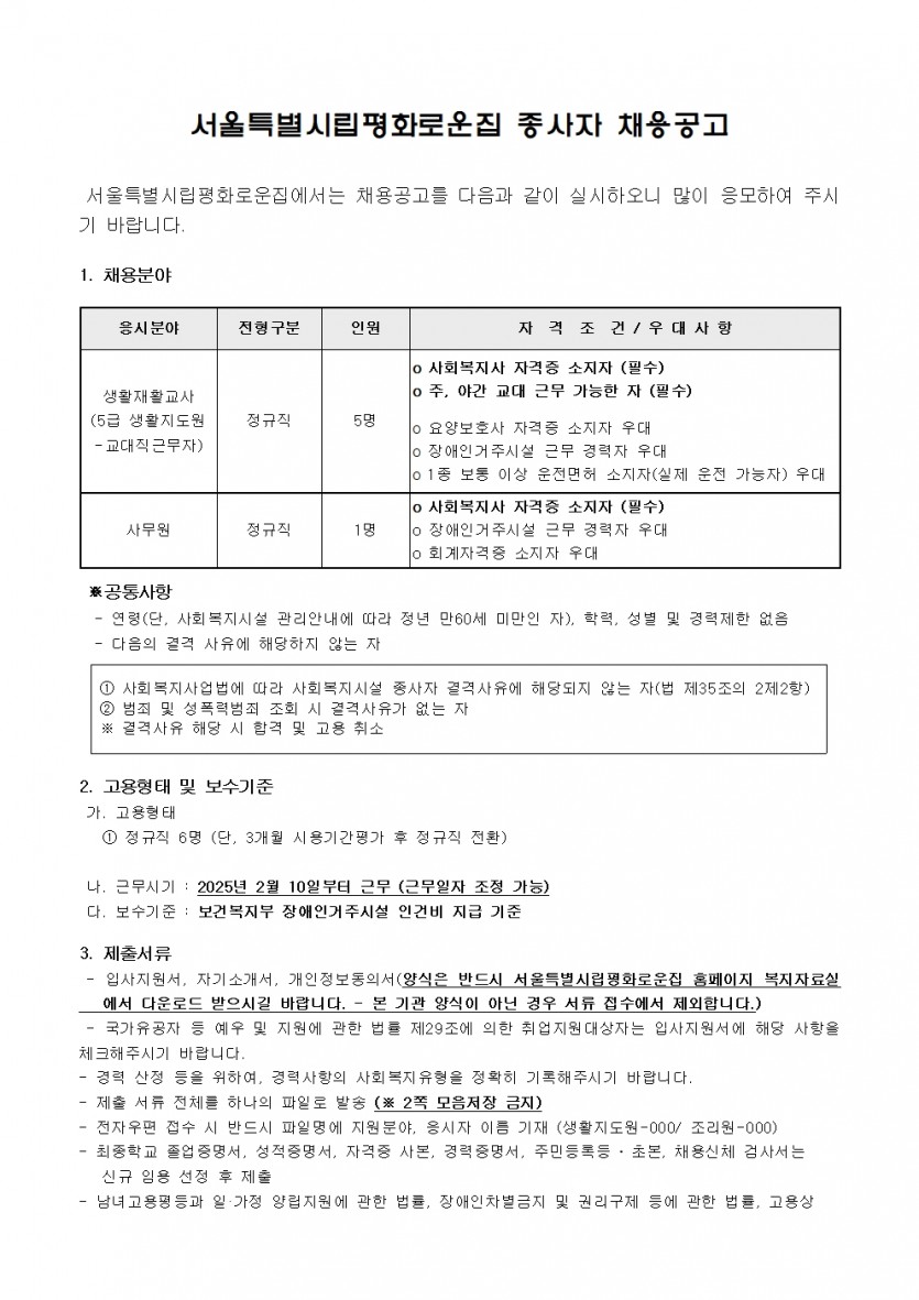서울시립평화로운집 2025년 1차 직원채용 공고 페이지 정보 작성자 한동주 작성일 25-01-15 11:16 조회 16,157회 댓글 0건 첨부파일 파일 2025년-생활지도원 사무원 1월.hwp (115.5K) 151회 다운로드 DATE : 2025-01-15 11:21:22 파일 시립평화로운집 입사지원서이력서,자기소개서및개인정보동의서.hwp (54.0K) 135회 다운로드 DATE : 2025-01-15 11:21:22 본문 이전글 다음글 목록 답변