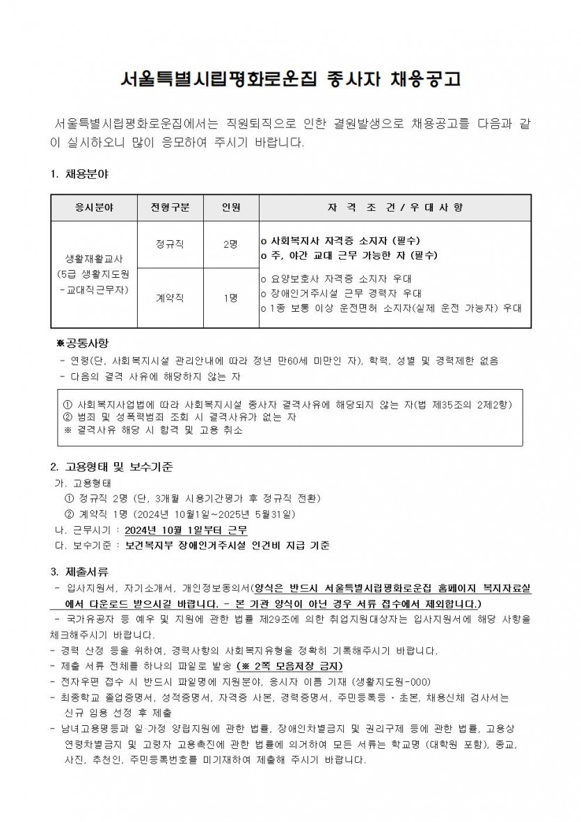2024년 제9차 종사자 채용 모집공고 페이지 정보 작성자 한동주 작성일 24-09-04 17:18 조회 17,872회 댓글 0건 첨부파일 파일 시립평화로운집 입사지원서이력서,자기소개서및개인정보동의서.hwp (22.5K) 132회 다운로드 DATE : 2024-09-04 17:18:55 파일 2024년-생활지도원 9월.hwp (36.5K) 109회 다운로드 DATE : 2024-09-04 17:18:55 본문 이전글 다음글 목록 답변
