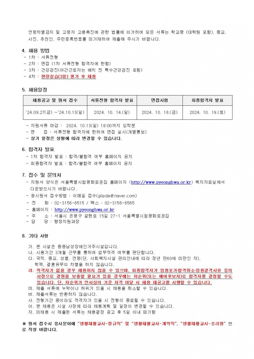 평화로운집 제10차 직원채용공고 페이지 정보 작성자 한동주 작성일 24-09-27 17:36 조회 17,505회 댓글 0건 첨부파일 파일 2024년-생활지도원 10월.hwp (36.5K) 108회 다운로드 DATE : 2024-09-27 17:36:34 파일 시립평화로운집 입사지원서이력서,자기소개서및개인정보동의서.hwp (22.5K) 80회 다운로드 DATE : 2024-09-27 17:36:34 본문 이전글 다음글 목록 답변