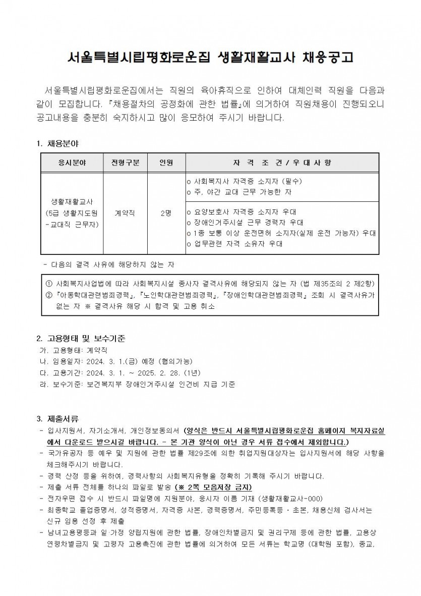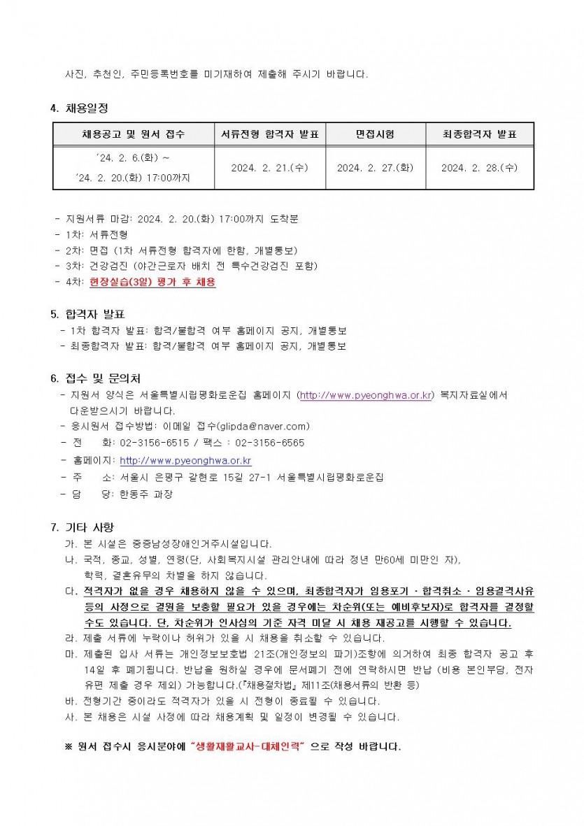 생활재활교사 대체인력 채용공고 페이지 정보 작성자 한동주 작성일 24-02-06 18:37 조회 19,751회 댓글 0건 첨부파일 파일 시립평화로운집입사지원서이력서,자기소개서및개인정보동의서.hwp (22.5K) 122회 다운로드 DATE : 2024-02-06 18:37:21 본문 이전글 다음글 목록 답변