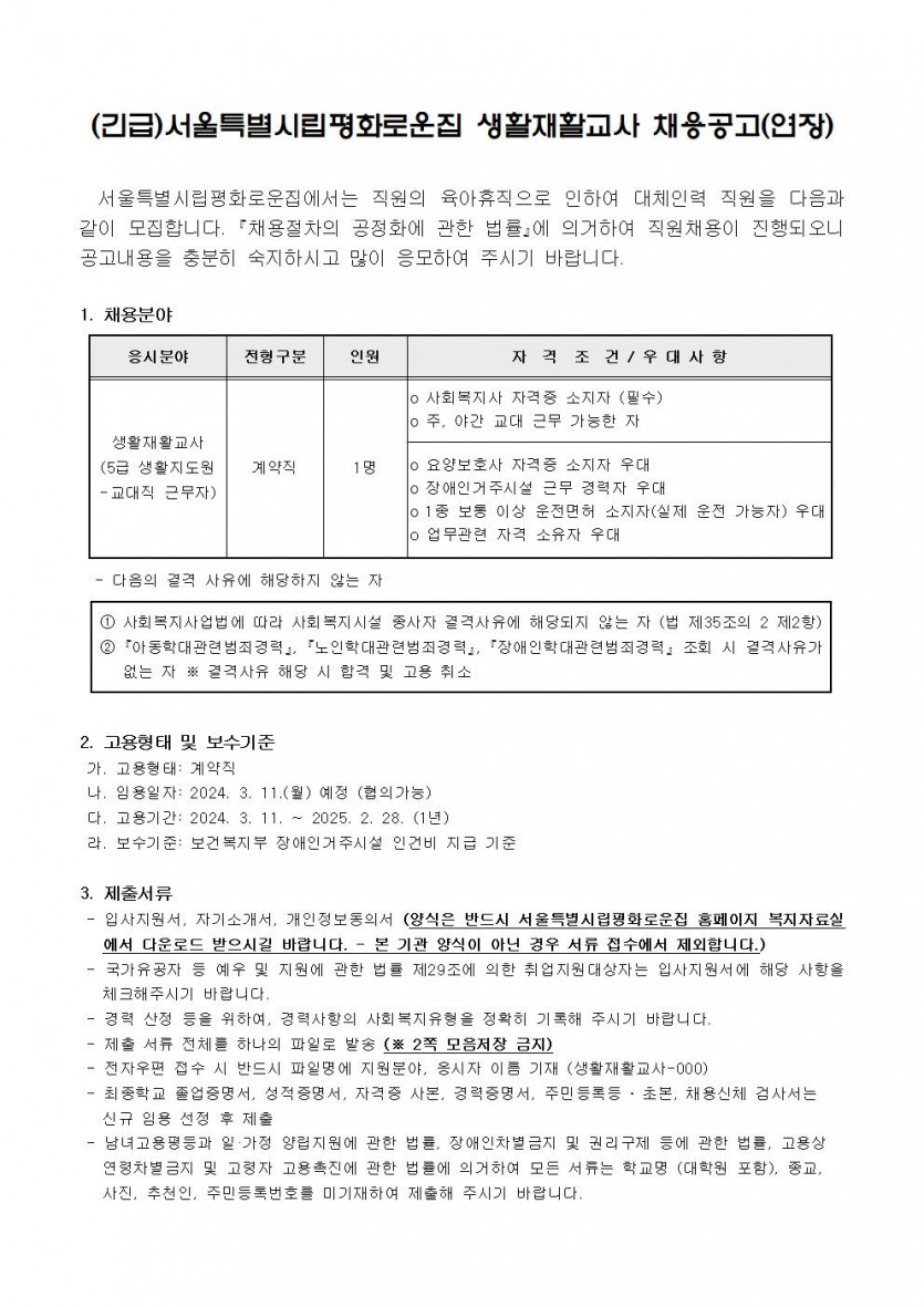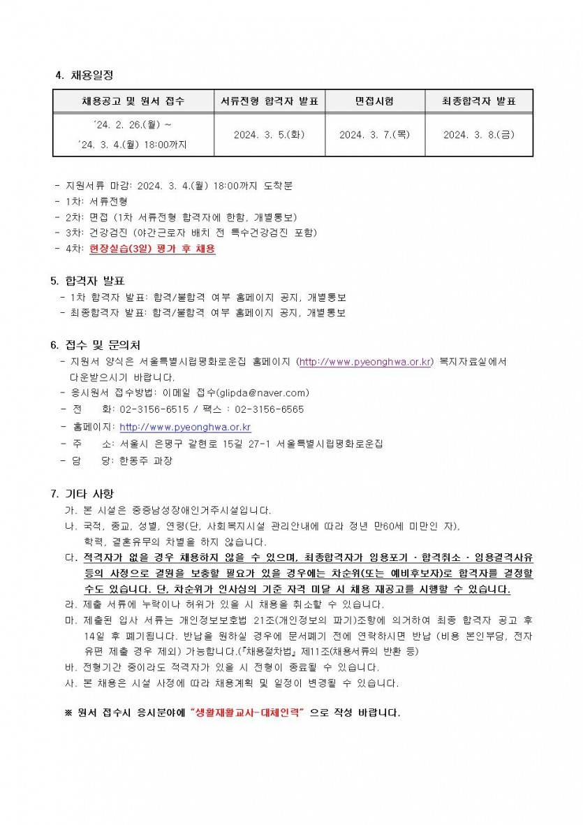 (긴급)서울특별시립평화로운집 생활재활교사 채용공고(연장) 페이지 정보 작성자 한동주 작성일 24-02-26 14:43 조회 20,156회 댓글 0건 첨부파일 파일 시립평화로운집 입사지원서이력서,자기소개서및개인정보동의서.hwp (22.5K) 143회 다운로드 DATE : 2024-02-26 14:43:58 본문 이전글 다음글 목록 답변