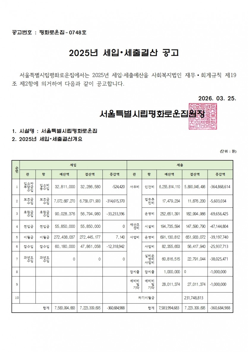 2025년 세입 세출 결산서 공고 페이지 정보 작성자 한동주 작성일 26-03-25 16:42 조회 85회 댓글 0건 첨부파일 파일 홈페이지 세입.세출견결산공고.pdf (58.6K) 4회 다운로드 DATE : 2026-03-25 16:42:12 본문 2025년 세입세출 결산서를 붙임과 같이 공고합니다. 이전글 다음글 목록 답변