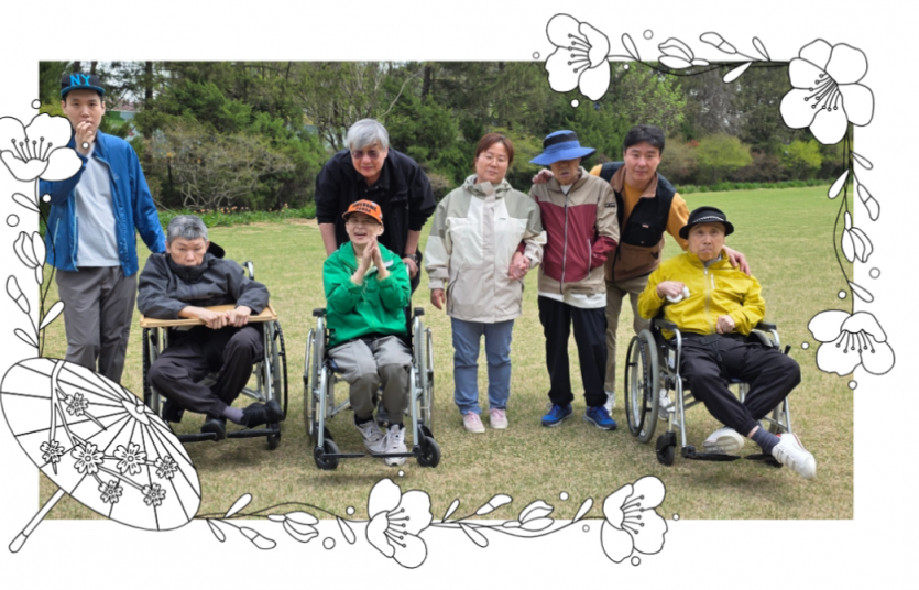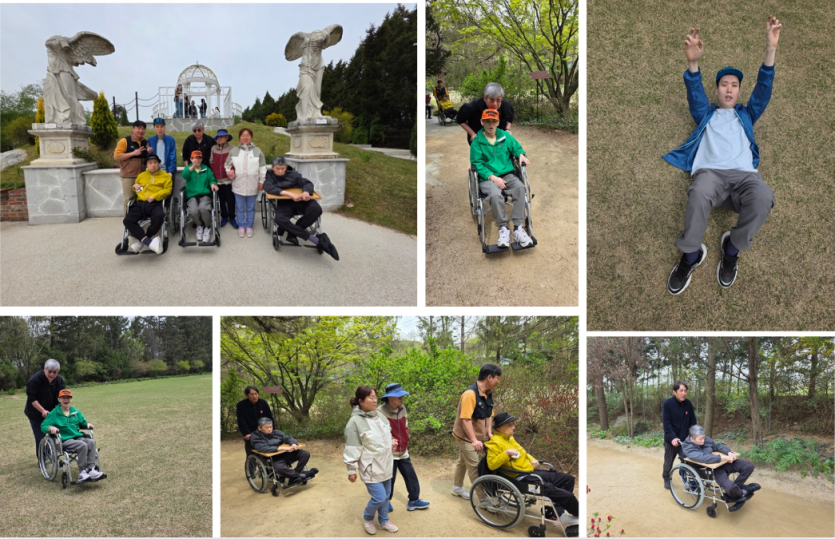 휠체어를 밀며 정원 곳곳을 거닐고, 푸른 나무 아래서 맑은 공기를 마시며 일상의 답답함을