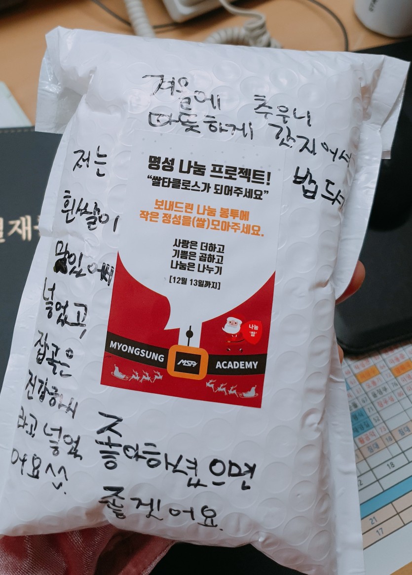 후원자·봉사자 이야기 | 명성체육관 후원물품 전달식 페이지 정보 작성자 박상은 작성일 19-12-30 17:27 조회 13,304회 댓글 0건 본문 매년 연말이면 우리 평화로운집에 따뜻한 나눔을 전하러 오시는 곳이 있습니다.바로 얼마 전 우수자원봉사단체상을 수상한 명성체육관 입니다!명성체육관에 다니는 아이들이 관장님의 마음을 따라나눔을 실천하고자 쌀을 모아주었습니다.아이들이 몇 달동안 함께 모아준 쌀 덕분에평화로운집 가족들은 올 겨울 내내 든든히 지낼 수 있을 것 같습니다^^천사같은 아이들의 손길로 모아진 값진 쌀!진심으로 고마움을 전합니다~♡ 이전글 다음글 목록