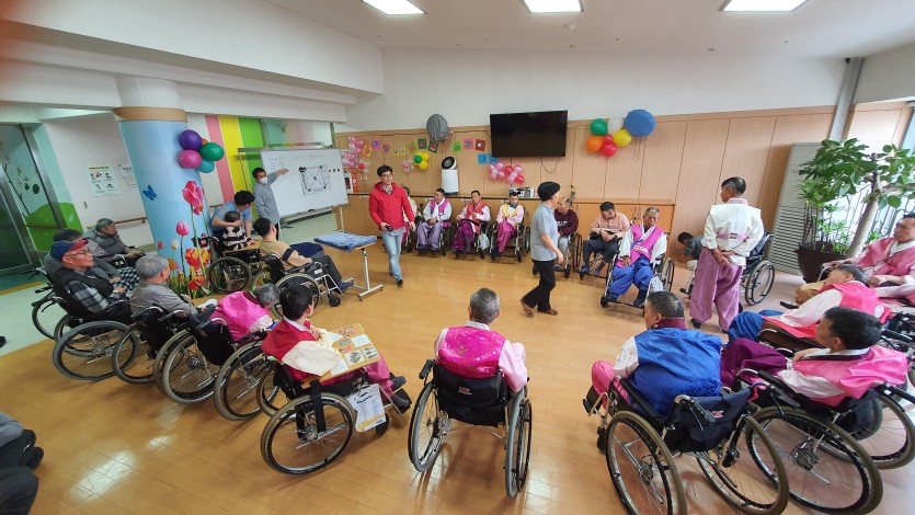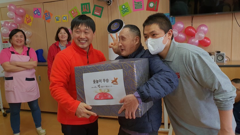 와상 거주인들까지 모두 어울릴 수 있는 윷놀이는 대형 윷을 하나씩 잡고 던지는 행동에 따라