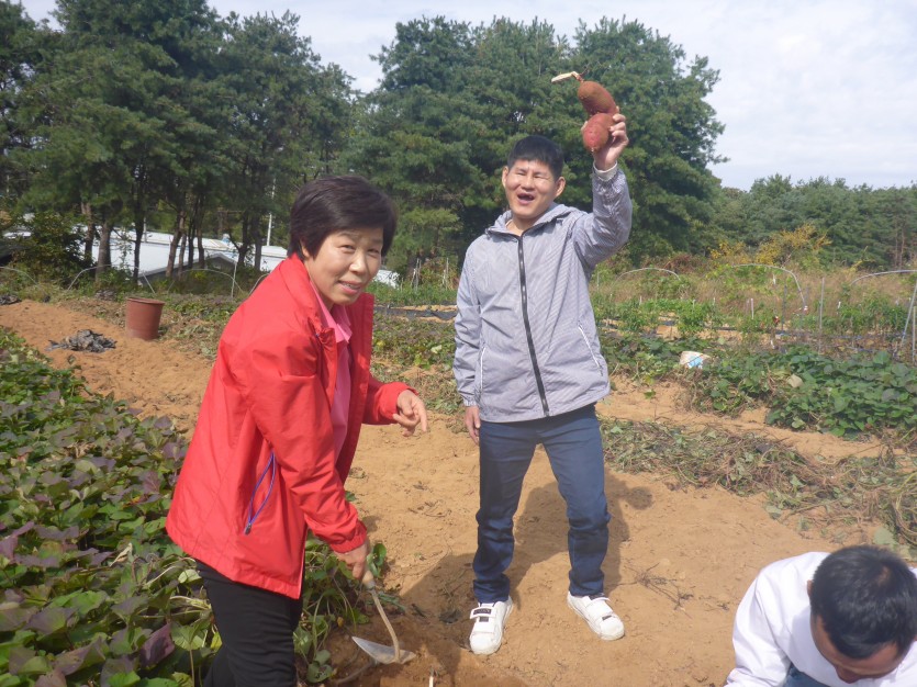 집 뒷마당 텃밭에서 처음 사용 해 보는 호미를 이용하여 고구마를 캐고, 쌈 채소 치커리도 뜯어서 돌아오는