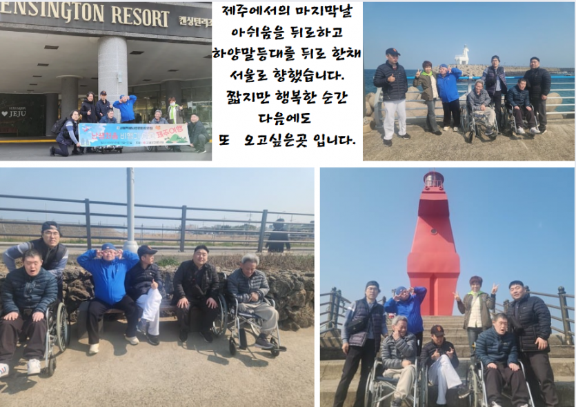 거주인 이야기 | "난생처음 비행기 타고" 제주 2차 여행 페이지 정보 작성자 장설궁 작성일 25-03-25 11:21 조회 5,657회 댓글 0건 본문 오늘은 선물입니다. 선물같았던 2박3일의 제주여행마음껏 즐기고... 감사하는 마음으로 보냈습니다. 특별한 날이 될 수 있도록 만들어 주심에 감사의 마음을 전합니다. 이전글 다음글 목록