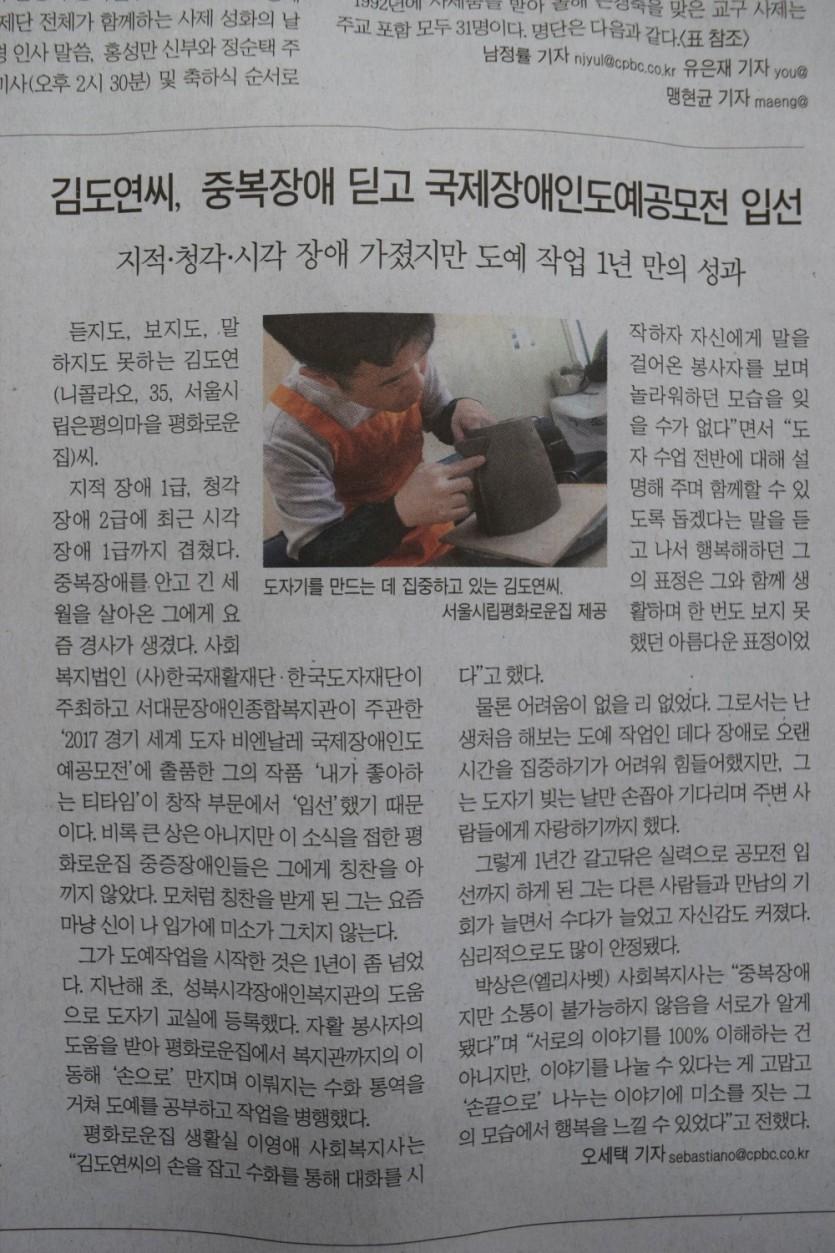 가톨릭평화신문-"김도연씨, 중복장애 딛고 국제장애인도예공모전 입선"