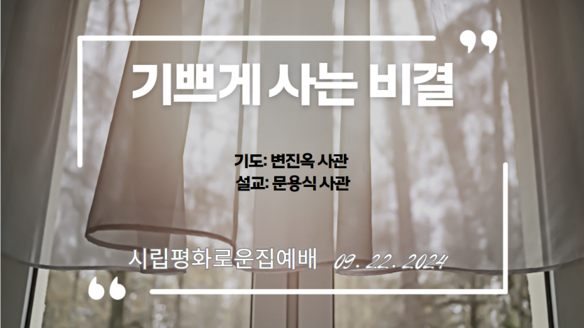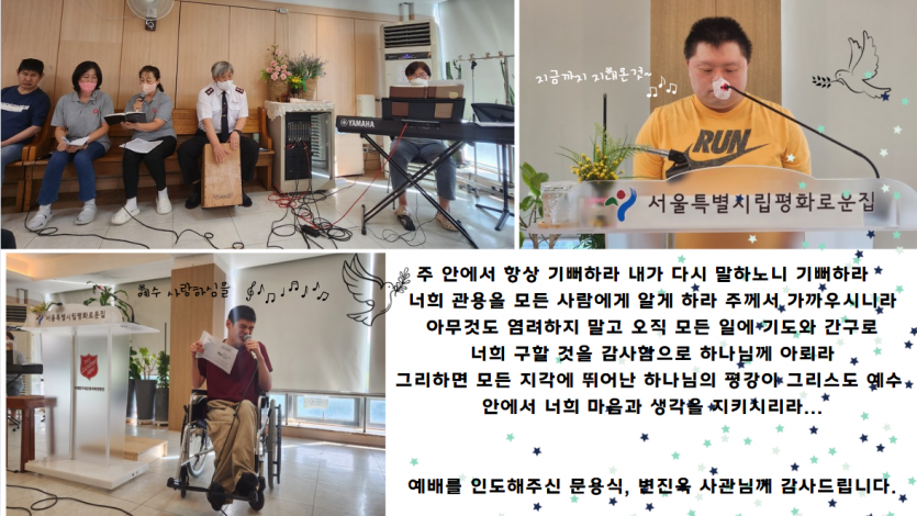 거주인 이야기 | 09.22. 주일 성결 예배 페이지 정보 작성자 장설궁 작성일 24-09-22 15:16 조회 7,221회 댓글 0건 본문 "주 안에서 항상 기뻐하라 내가 다시 말하노니 기뻐하라"기쁘게 사는 비결 정직함을 잃어버리지 마시고, 지난 과오는 잊어버리시고 하나님은 우리의 지난 과오는 기억하지 않으시니..문용식 사관님께서 전해주신 말씀처럼 스스로 자기 삶에 만족하고항상 기뻐하시기를 바라겠습니다~예배를 인도해주신 문용식, 변진옥 사관님 감사합니다. 이전글 다음글 목록