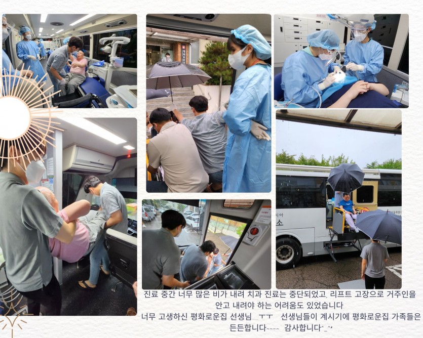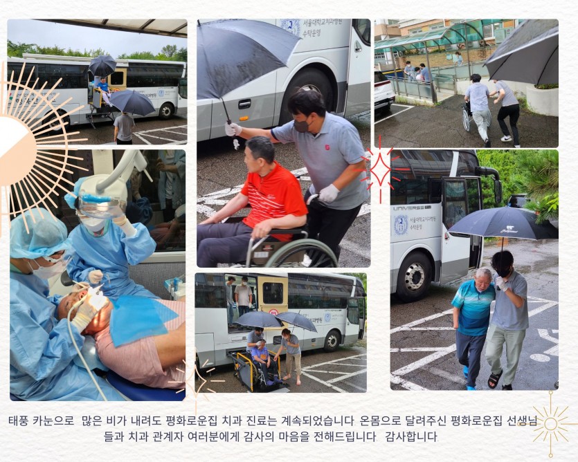 거주인 이야기 | 0810 2차 치과진료 페이지 정보 작성자 장설궁 작성일 23-08-10 17:53 조회 9,099회 댓글 1건 본문 태풍 카눈이 북상하며 많은 비가 내리는 가운데 장애인치과병원 2차 진료가 진행되었습니다. 의료진과 평화로운집 선생님들에게 다시 한번 감사의 마음을 전합니다."감사합니다" 태풍의 영향으로 강풍과 폭우가 예상된다고 합니다. 태풍으로 인한 피해 없도록 조심하세요무사히 태풍이 지나가기를 바랍니다. 댓글목록 조윤기님의 댓글 조윤기 작성일 23-08-18 19:26 비가 오는 가운데 모두 수고 많으셨습니다 비가 오는 가운데 모두 수고 많으셨습니다 이전글 다음글 목록