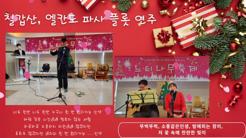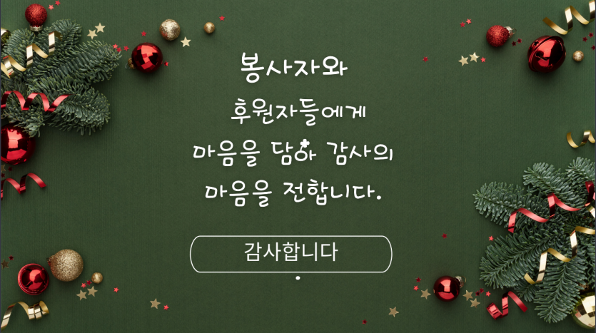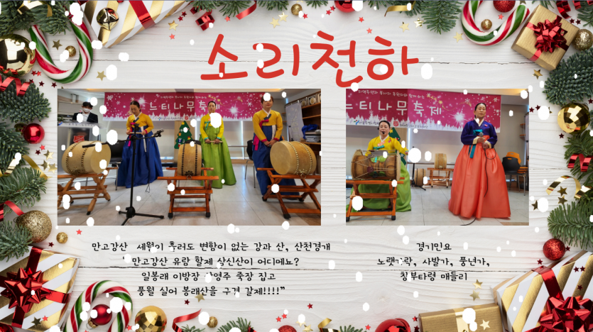 후원자·봉사자 이야기 | 1207 느티나무 축제 페이지 정보 작성자 장설궁 작성일 24-12-12 13:19 조회 6,571회 댓글 0건 본문 "2024년 12월 7일거주인, 자원봉사자, 후원자들과 함께 느티나무 축제를 진행하였습니다. 참석해주신 여러분들에게 감사의 마음을 전합니다. 여러분의 따뜻한 마음과 참여로 인해 행사는 더욱 특별하고 의미 있는 시간이 되었습니다. 여러분의 지지와 도움에 진심으로 감사드립니다. 다시 한 번 참석해주신 여러분들에게 진심으로 감사의 말씀을 전하며, 앞으로도 함께 더 많은 아름다운 순간을 만들어 나가기를 기대합니다. 감사합니다." 이전글 다음글 검색 목록