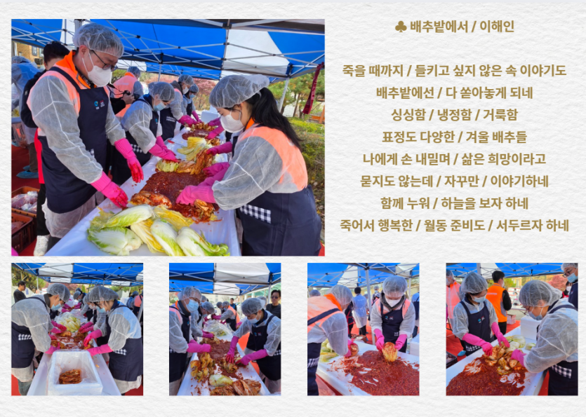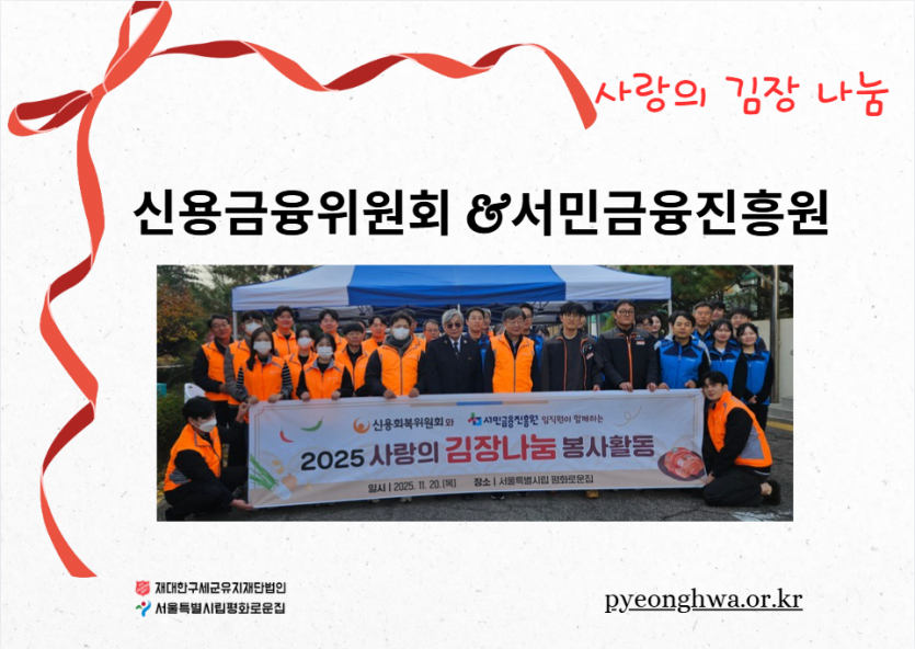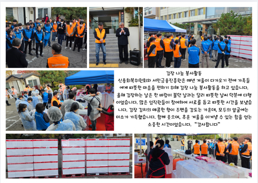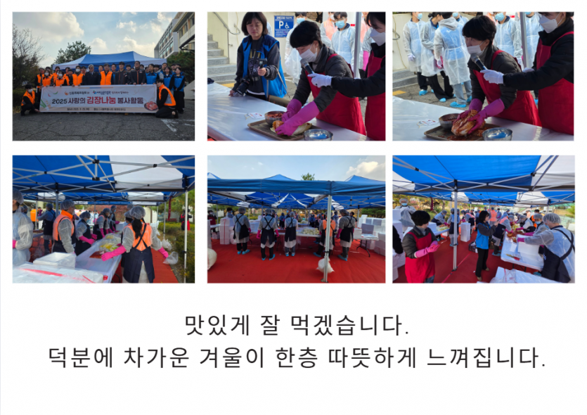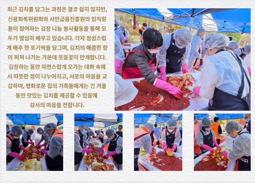 후원자·봉사자 이야기 | 신용회복위원회와 서민금융진흥원과 함께 하는 김장 페이지 정보 작성자 장설궁 작성일 25-11-26 11:16 조회 1,689회 댓글 0건 본문 신용회복위원회와 서민금융진흥원과 함께한 김장임직원분들께서 직접 김치를 담으며 가족분들이 겨울에 맛있게 드신다는 생각에 한 포기 한 포기 정성을 담아따뜻한 마음을 전해주셨습니다. 이 김치가 식탁에 오를 때마다 사랑이 깃든 이 따스함을잊지 않겠습니다. 함께해 주신 모든 분들께 다시 한 번 깊은 감사를 드립니다.고맙습니다.감사합니다. 이전글 다음글 목록