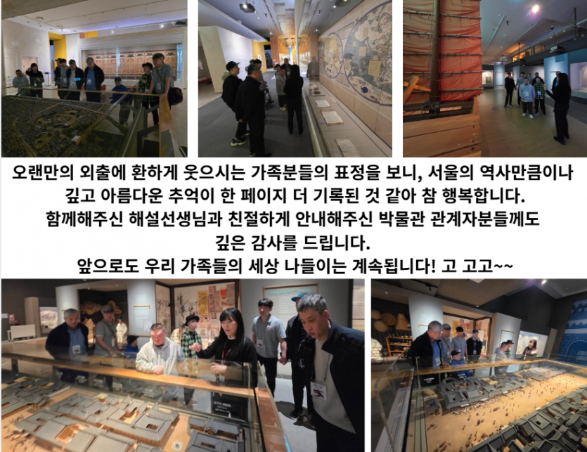 거주인 이야기 | 서울역사박물관 견학 페이지 정보 작성자 장설궁 작성일 26-04-03 17:37 조회 41회 댓글 0건 본문 살랑살랑 불어오는 봄바람을 타고, 우리 평화로운집 가족들은 서울의 역사가 살아 숨 쉬는 '서울역사박물관'으로 나들이를 다녀왔습니다.박물관 곳곳을 둘러보며 옛 서울의 풍경에 발길을 멈추기도 하고, "예전엔 이랬지~" 하며 정겨운 옛 기억을 소환해보기도 하는 뜻깊은 시간이었습니다. 세심하게 준비된 전시물들 덕분에 가족분들도 모두 편안하고 즐겁게 관람을 마칠 수 있었습니다. 다음글 목록