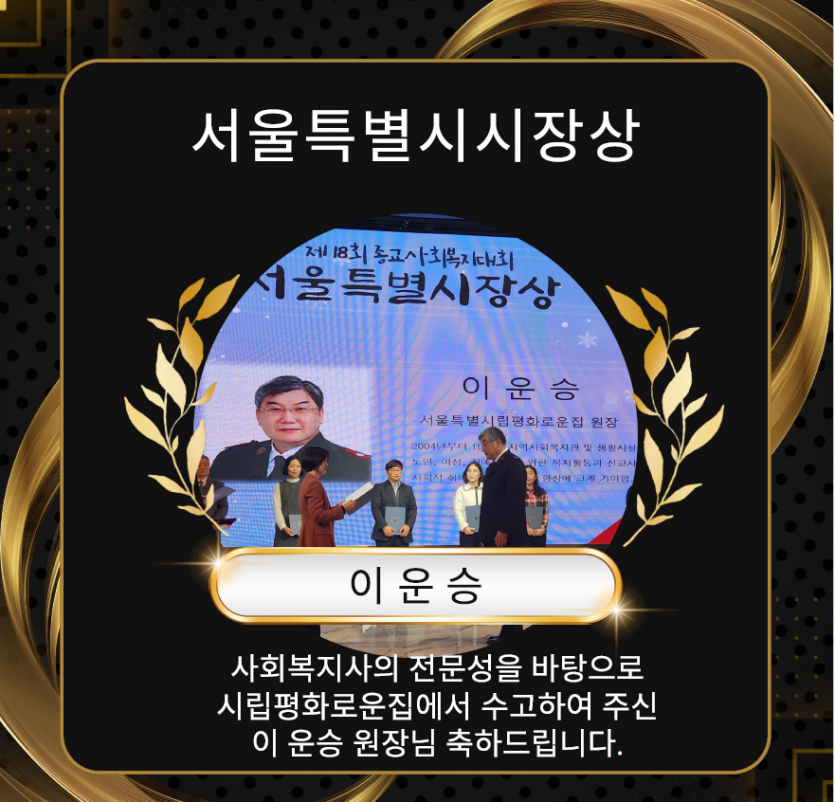 제18회 종교사회복지대회 서울특별시장상 페이지 정보 작성자 장설궁 작성일 24-01-10 11:51 조회 6,158회 댓글 0건 본문 지난 12월 27일 오후 4시 30분 서울 마포구 케이터틀에서 ‘제18회 종교사회복지대회’를 개최했습니다사회복지의 성장을 위해 헌신한 서울특별시립평화로운집 이운승 원장님께서 서울특별시시장상 수상하셨습니다. 축하드립니다. 이전글 다음글 목록