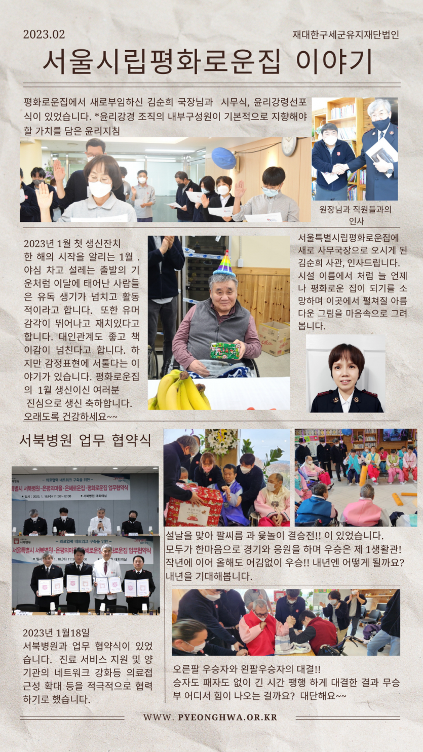 2023년 2월 후원감사편지 페이지 정보 작성자 장설궁 작성일 23-02-13 11:31 조회 10,837회 댓글 0건 본문 안녕하세요? 후원자님겨울 추위가 막바지에 다다른 2월 입니다. 아직 추위가 매섭지만 조금만 더 기다리면 봄이 온다는 생각에 기다림이 즐겁지 않으시나요?포근한 봄을 맞이하기 위해 건강 관리 잘 하시고 몸도 마음도 다가올 봄의 활력으로 가득 채워보시길 바라면서 ^^평화로운가족들의 이야기를 들려들입니다~~ 항상 행복 하세요♡ 이전글 다음글 목록