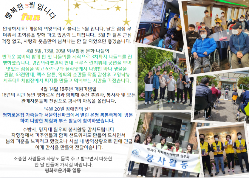 2023년 5월 후원감사편지 페이지 정보 작성자 장설궁 작성일 23-05-10 16:23 조회 9,996회 댓글 0건 본문 초록 세상 5월입니다.화사한 꽃과 함께 싱그러운 나뭇잎을 보며 마음의 평화와 기쁨을 느껴 보시길 바라며 평화로운 가족의 소식을 전해드립니다. 이전글 다음글 목록