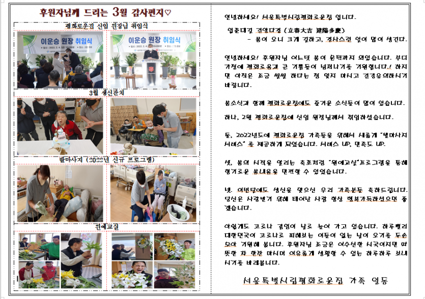 2022년 3월 후원자 감사편지 페이지 정보 작성자 장설궁 작성일 22-07-08 13:10 조회 12,021회 댓글 0건 본문 ♧ 그 어느 해보다 바쁘고 힘겨웠던 겨울을 보낸 뒤 그 어느 해처럼 반갑게만 느껴왔던 봄을 맞이하였습니다. 포근한 햇살에 포근한 봄바람을 실어 평화로운집 식구들의 소식을 전해드립니다~~~ ♧ 이전글 다음글 목록