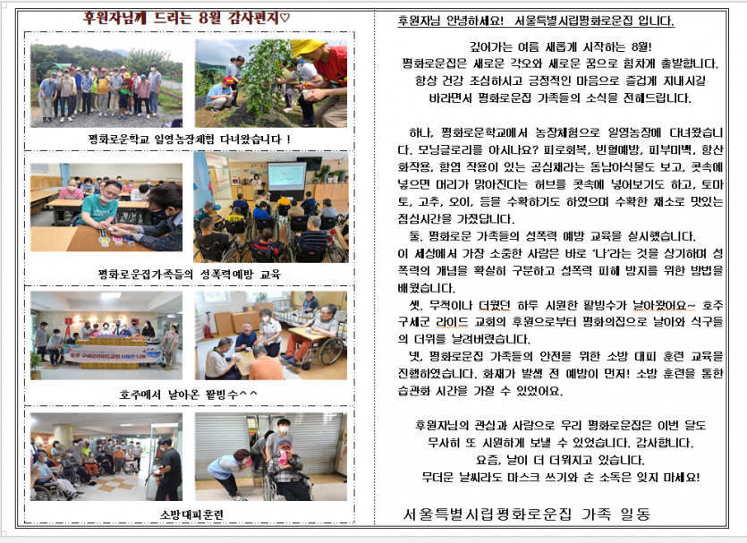 2022년 8월 후원자 감사편지 페이지 정보 작성자 장설궁 작성일 22-08-08 10:43 조회 11,889회 댓글 0건 본문 8월은 내가 나에게 휴식을 선물하는 의미 있는 달이였으면 좋겠습니다.새해를 열면서 다짐했던 것을 실천하고 있는 나에게 선물을 주는 8월!그 선물 속에는 가족과 친구가 있고 함께 지낸 사람들의 고마움도 담겨 있겠지요.시간은 빠르게 지나갑니다. 누구나 그러하듯이 또 다른 한 해를 향한 남은 시간도 더 빠르게 지나가겠지요 (●'◡'●)8월에 받은 선물이 가을과 겨울로 이어져서 행복이 될 수 있게 꿈이 담겼으면 좋겠습니다. 이전글 다음글 목록