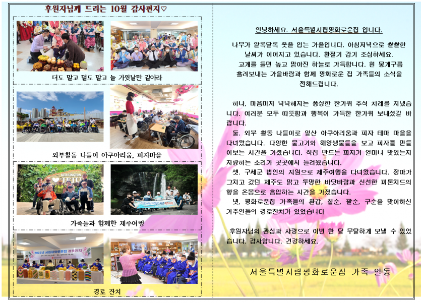 2022년 10월 후원감사편지 페이지 정보 작성자 장설궁 작성일 22-10-02 14:02 조회 11,348회 댓글 0건 본문 후원자님 안녕하세요 잘지내셨나요?아침저녁 공기가 제법 차가워진 10월입니다높고 푸른 가을 하늘과 시원한 가을바람에 기분 좋은 가을의 문턱!맑고 높은 가을 하늘처럼 늘 후원자님에게 좋은 일만 가득하길 바라며 10월 평화로운집 가족들의 이야기를 전합니다. 이전글 다음글 목록