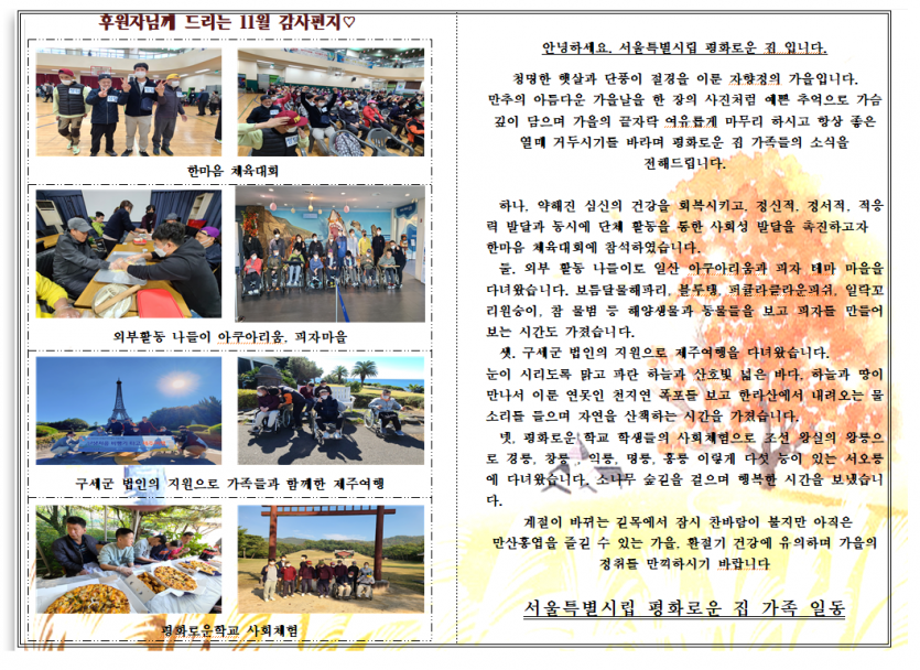 2022년 11월 후원감사편지 페이지 정보 작성자 장설궁 작성일 22-11-06 13:22 조회 10,971회 댓글 0건 본문 벌써 11월이네요.가을이 점점 깊어갑니다.화려했던 단풍들도 이제 낙엽이 되어 떨어지기 시작합니다.수북히 쌓인 낙엽길도 걸어보시면서..여유롭게 보내시면 좋겠습니다.11월도 건강하시고,하시는 모든일에 행운과 행복이 가득하시길 바랍니다.아자!아자! 화이팅! 이전글 다음글 목록