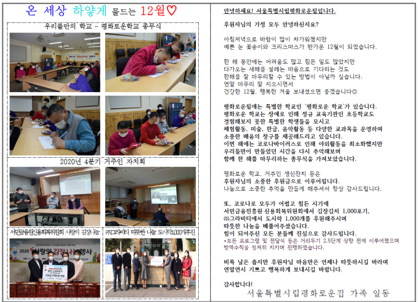 2020년 12월 후원자 감사편지 페이지 정보 작성자 박상은 작성일 21-01-21 13:38 조회 14,145회 댓글 0건 본문 2020년 12월, 크리스마스 캐롤 울려퍼지는 설레는 겨울에 늘 나눔으로 함께해주시는 후원자님께감사의 편지를 올립니다. 이전글 다음글 목록