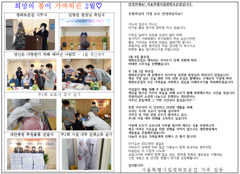 2021년 2월 후원자 감사편지 페이지 정보 작성자 박상은 작성일 21-02-06 17:02 조회 13,823회 댓글 0건 본문 2021년 2월, 어느새 봄이 다가오고 있습니다.늘 나눔으로 함께해주시는 후원자님께감사의 편지를 올립니다. 이전글 다음글 목록