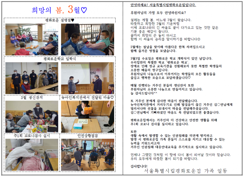 2021년 3월 후원자 감사편지 페이지 정보 작성자 박상은 작성일 21-04-06 13:48 조회 14,002회 댓글 0건 본문 2021년 3월, 후원자님의 마음과 같은 따뜻한 봄입니다.늘 나눔으로 함께해주시는 후원자님께감사의 편지를 올립니다. 이전글 다음글 목록