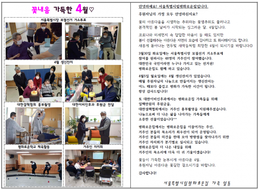 2021년 4월 후원자 감사편지 페이지 정보 작성자 박상은 작성일 21-04-07 09:40 조회 14,314회 댓글 0건 본문 2021년 4월, 활짝 핀 꽃들의 아름다움처럼 빛나는 후원자님의 나눔에 감사드립니다.늘 나눔으로 함께해주시는 후원자님께감사의 편지를 올립니다. 이전글 다음글 목록