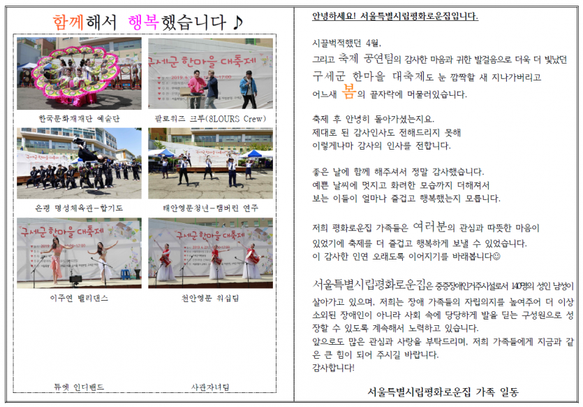 2019년 4월 연합축제 공연팀 감사편지 페이지 정보 작성자 박상은 작성일 20-09-11 11:50 조회 13,575회 댓글 0건 본문 첫 실시된 3개시설 연합축제에 귀한 발걸음 해주시고멋진 공연을 선물해주신 관계자 분들께감사의 편지를 올립니다. 이전글 다음글 목록