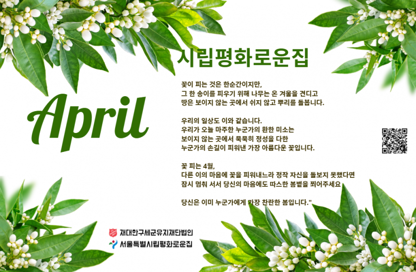 2026년 시립평화로운집 4월 후원감사편지 페이지 정보 작성자 장설궁 작성일 26-04-01 16:51 조회 24회 댓글 0건 본문 꽃보다 아름다운 마음을 나누어 주시는 후원자님께 감사드립니다. 후원자님의 나눔은 우리 거주인 분들에게 따뜻한 밥 한 끼가 되고, 깨끗한 보금자리가 되며, 내일을 살아갈 희망이 됩니다.보내주신 사랑에 보답하기 위해 오늘도 저희는 정성을 다해 거주인 분들을 모시겠습니다. 기분 좋은 봄바람처럼 늘 행복한 일들만 가득하세요! 다음글 목록