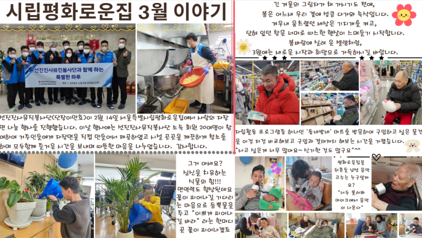 2025년 3월 시립평화로운집 후원감사편지 페이지 정보 작성자 장설궁 작성일 25-03-04 15:15 조회 4,635회 댓글 0건 본문 HELLOSPRING^^겨울의 추위를 견뎌낸 우리에게 희망과 설렘을 선물하는 3월꽃처럼 피어나는 행복을 가득 담아 보내드립니다. 이전글 다음글 목록