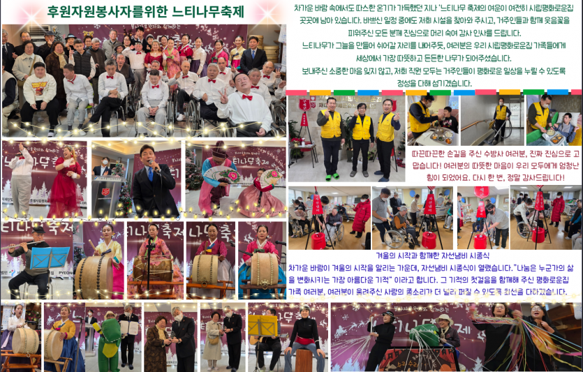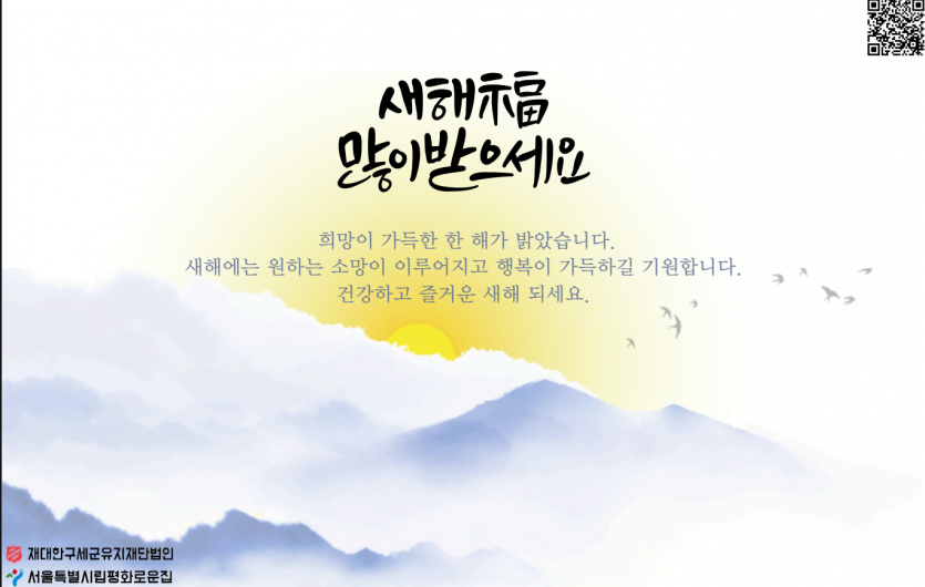 2026년 시립평화로운집 1월 후원감사편지 페이지 정보 작성자 장설궁 작성일 26-01-04 09:52 조회 887회 댓글 0건 본문 2026년 병오년이 밝았습니다. 지난 한 해 보내주신 배려에 깊이 감사드리며, 새해에도 건강과 평안이 늘 함께하시길 기원드립니다.병오년 새해를 맞아 가정에 행복이 가득하시고, 하시는 일마다 좋은 결실이 있기를 바랍니다. 이전글 다음글 목록